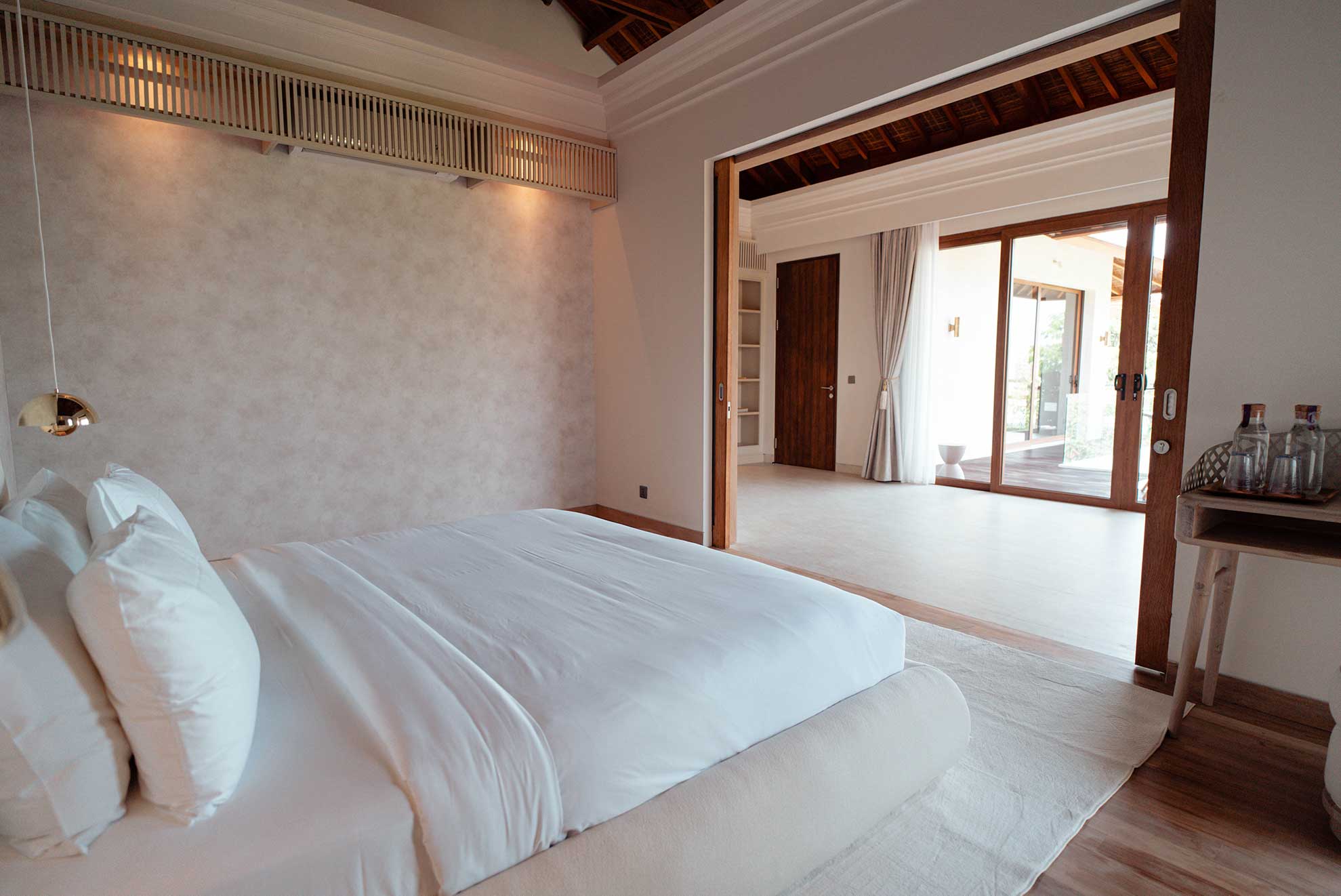 The first bedroom, or the Satu Master Suite comes with its own study or library, a bedroom area and a large ensuite featuring a large soaking tub, an outdoor shower & a walk-in closet.